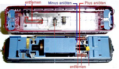 Im Motorwagen werden die beiden Drosseln und der Kondensator entfernt. Dann wird im Gehäuse das Blech unter