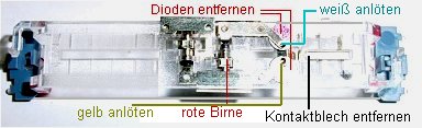 gezogen. Die Litzen werden dann an die beiden Federbleche gelötet die zu den Birnen führen. Hat man sich vertan