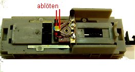 Von den beiden Schleiferfedern werden die Laschen abgeschnitten und an dieser Stelle je eine rote und blaue