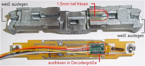einen Ausschnitt in der Größe des Decoders ausfräsen. Platine aufsetzen und Decoder einlegen, sodann rundherum auf