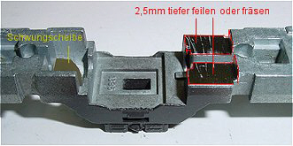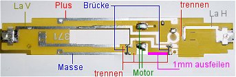 vorn ein 8 mm breites, 1mm tiefes Stück herausfeilt. Hier werden später die Litzen des Decoders DHL100 nach