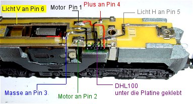 Umbauanleitung: Es passt ein Trix 66830 oder wie hier ein DHL100 kopfüber unter die Platine in eine