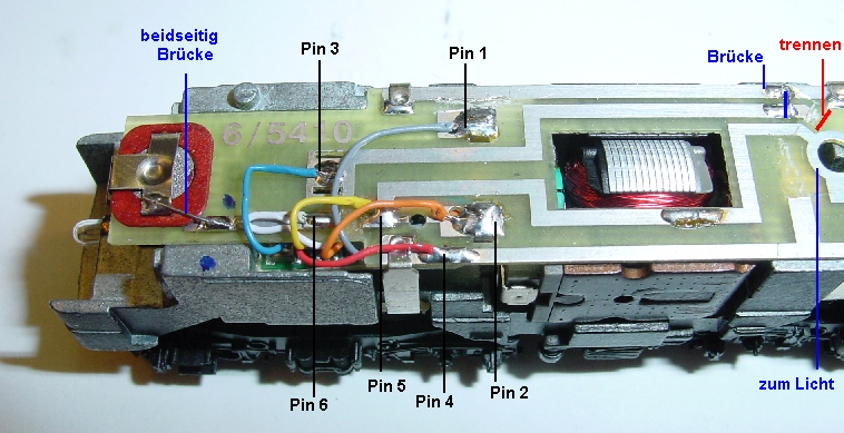 Pin 3 blau direkt an den linken Rest der Oberleitungsleiterbahn löten. Pin 4 rot an Plusleiterbahn unten im Bild.