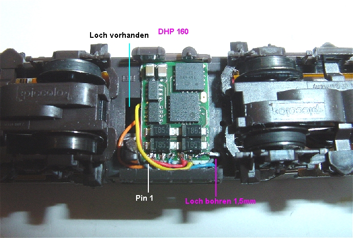 Man sieht, das der Decoder quer wegen den Drehgestellen nicht gepasst hätte. Pin 1 links grau.
