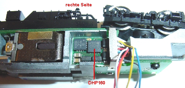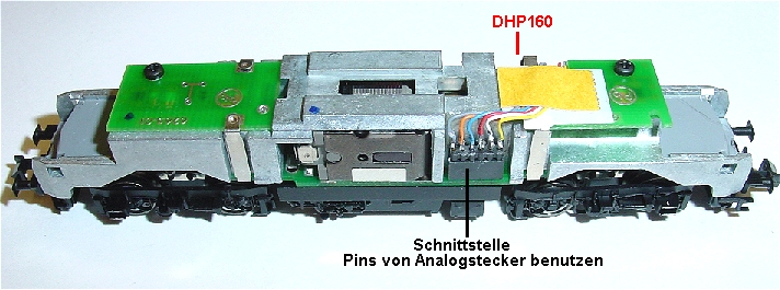 Die Lok hat zwar eine Fleischmann Schnittstelle die jedoch durch andere Decoder nicht einfach zu benutzen ist sondern umgebaut werden muß.Decoder mit angelöteten Litzen auf der rechten Seite einkleben und Litzen nach oben führen. Der Analogstecker wird entfernt und die 6 Messingpins von der Miniplatine abgelötet. Dann werden die 6 Decoderlitzen an die eingesteckten Stifte angelötet. Pin 1 blau links weiter wie im Bild zu sehen. Copyright Hinweis
