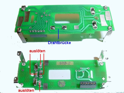Auf der Platinenoberseite werden die bezeichneten SMD -Teile ausgelötet. Wenn der Decoder länger als die