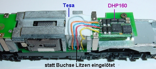 Hier wurde die gesamte Buchse ausgelötet und die Decoderlitzen direkt in die Platinenlöcher gelötet. Einfacher