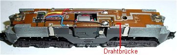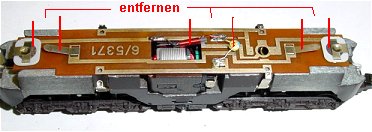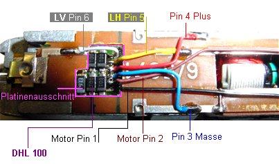 sie sonst Massekontakt am Fahrgestellblock bekommen. Die Motorverbindung der Platinenleiterbahn unten muss