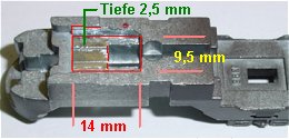 Ausschnitt ausgefräst. länge 14mm, Breite 9,5 mm, Tiefe so tief, das die Platine noch 1mm über der Schnecke