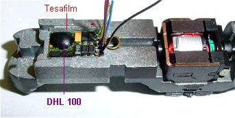 Hier sitzt der Decoder DHL100, bereits mit Tesafilm isoliert und eingeklebt, im vorher gefrästen Ausschnitt.