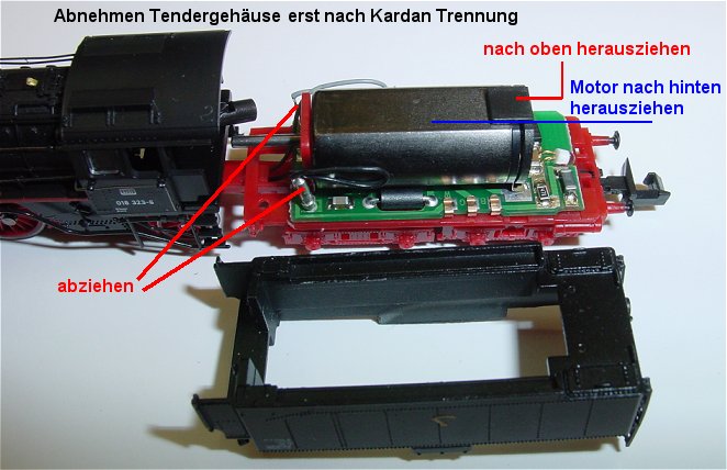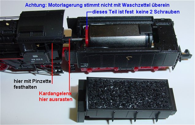 Tendergehäuse abnehmen, dazu muss die Kardanwelle getrennt sein. Mit Pinzette die Kardankupplung des Lokteiles festhalten