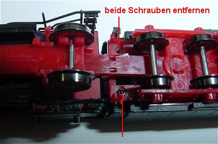 Erster Schritt Kohleaufsatz nach oben abheben. Dann beide Schrauben auf der Unterseite des Tenders (siehe nächstes Bild)