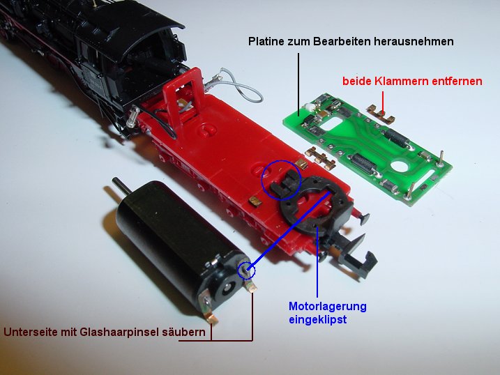 Beide Litzen von der Lok werden von den Platinenstiften abgezogen. Die Platine wird herausgenommen und bearbeitet. Jeweils