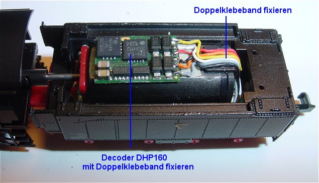 Der Decoder DHP160 ist mit Doppelklebeband aufgeklebt und die Litzen angelötet. Damit das Klebeband nicht durch das Anlöten