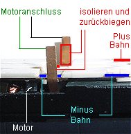 Hier sieht man die beiden Motorfedern, die ich mit Schrumpfschlauch gegen Ballastblock isoliert habe. Wer das Risiko liebt