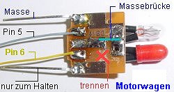 Lampenteil im Motorwagen aushängen, wird bearbeitet. Beide Dioden auslöten und je einen Lampendraht in ein Loch der
