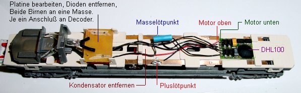 Platine ist umgelötet und wieder eingesetzt. Decoder hinten eingeklebt. Pin 1 ist oben links im Bild. Den Plus und