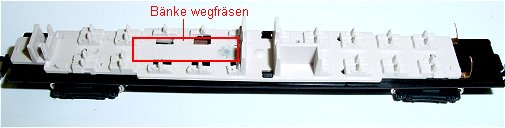 Der Schluss- oder Steuerwagen. Hier fräsen wir etwas von den Sitzreihen weg, so das der Schaltdecoder (hier ein FD2) nahezu