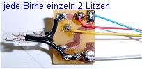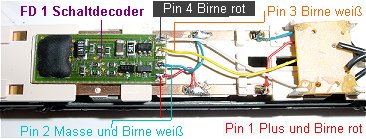 Die Verdrahtung des Steuerwagens: Hier mit FD2. Beim FD2 hat jede Birne ihre eigene Masse. Also im Bild unten rechts