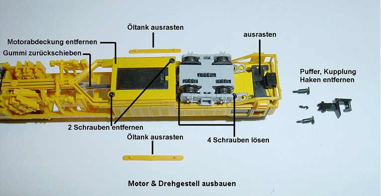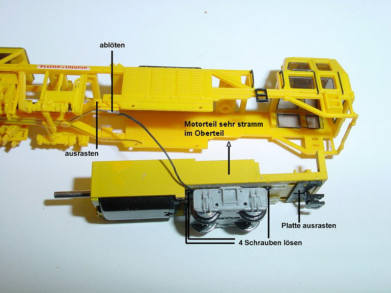 besser herausgenommen werden.Unterteil mit Motor und Achsen nach unten herausnehmen. Dazu hinter dem Führerhaus von oben