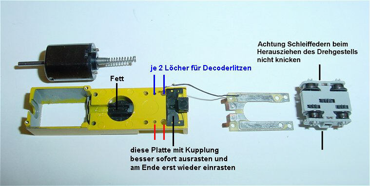 Drehgestells auf die Platine damit die Schleiferfedern nicht verbogen werden, sie hakeln gerne in den beidseitigen Löchern.