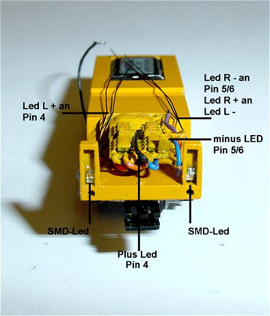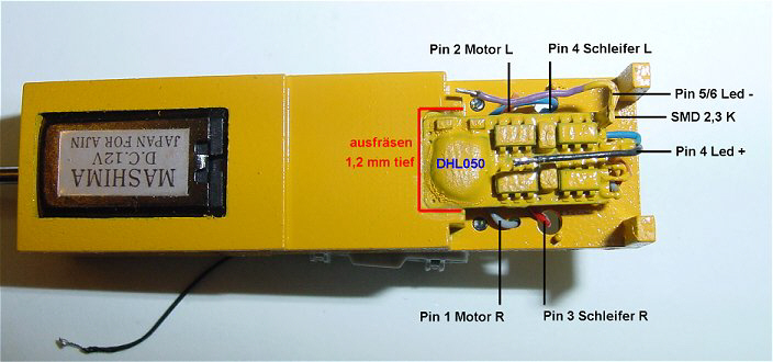 unten zur Platine gezogen. Vorschlag: Vor dem Aufkleben gelb lackieren, dann fällt der Decoder nicht auf. Litze Pin 1 und 3