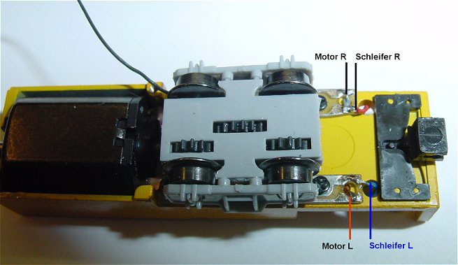 Am rechten Ende werden beide Leiterbahnen getrennt. damit hat man Lötpunkte für den Decoder und der Motor ist potenzialfrei.