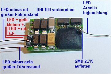 Umbauanleitung: hier mit Selectrixdecoder SLX 831 = DHL050 und LED Beleuchtung vorne, Decoder im kleinen Führerhaus mit freiem Führerhausdurchblick.