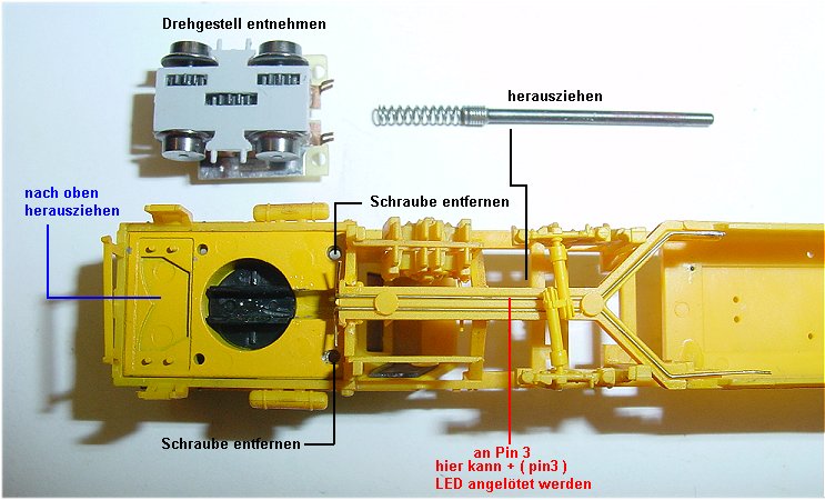 Der große Führerstand wird zerlegt. Dazu 2 Schrauben auf der Platine entfernen, die Platine samt Drehgestell abnehmen, die