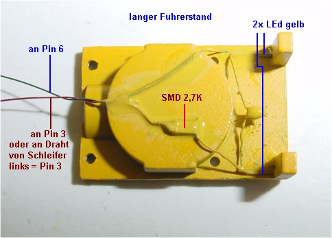 LEDs im großen Führerstand und hier wird in die jeweilige Zuleitung ein SMD Widerstand 2,7 K eingefügt bevor an die