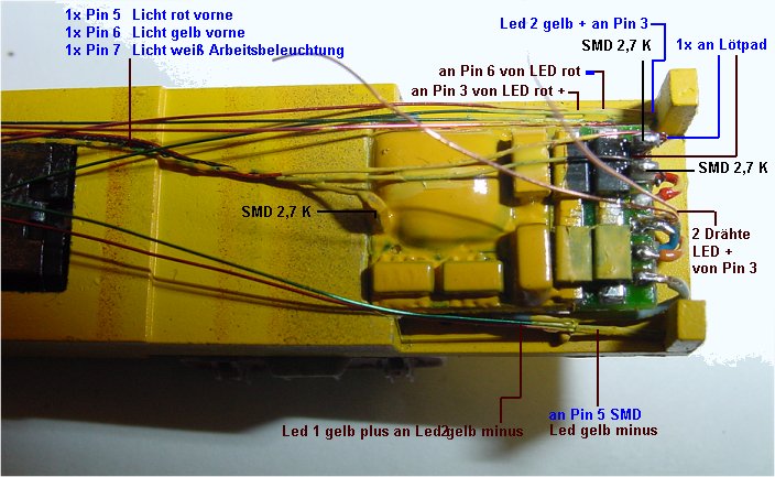 Etwas verwirrend der Drahtverhau aber zur Ansicht nötig. Auch diesen Decoder habe ich vor dem Einkleben halb gelb lackiert