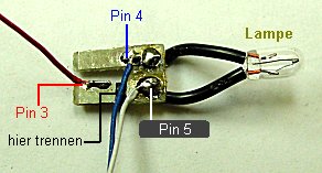 getrennter Lampenplatine. Pin 4 blau von Lampenplatine oben. Pin 5 weiß von Birne vorn.