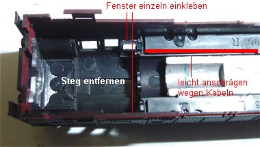 Roter Strich leicht anschrägen. Der Fenstereinsatz wird herausgenommen und die Fenster abgeschnitten und einzeln eingeklebt