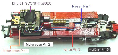 Der Decoder, hier SLX870 ist aufgeklebt und verdrahtet. Pin 1 links orange Motor unten. Pin 2 grau Motor oben. Pin 3 rot von