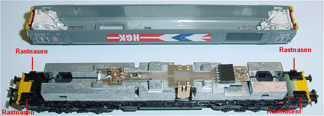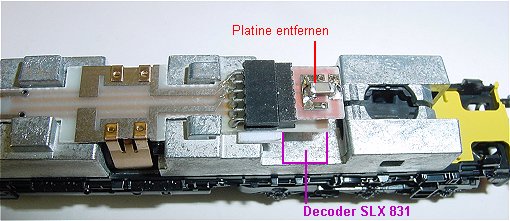 Umbauanleitung: Es passt ein SLX831= DHL050 oder ein DHL100=Trix66830 oder ein Kühn N025 etc unter den Stecker.