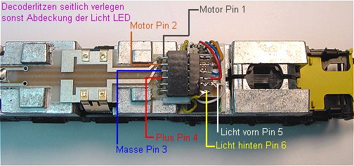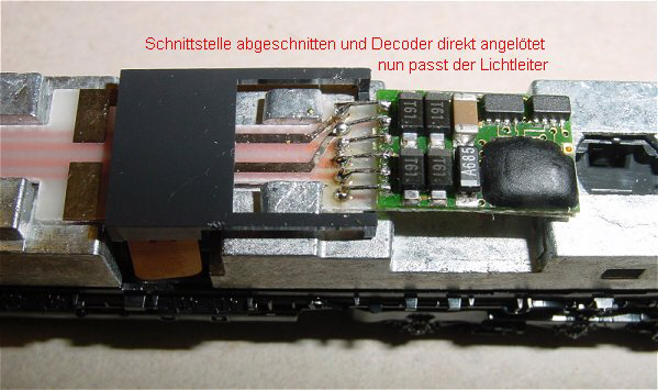 Die Schnittstellenbuchse abzwicken und den Decoder an die verbliebenen Pins anlöten.