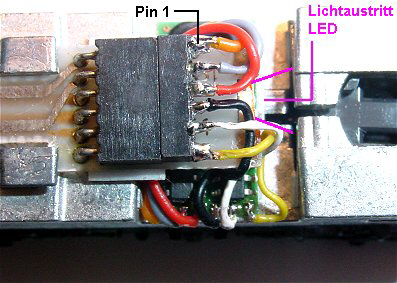 Decoder DHL050 quer eingeklebt, Anschlösse hier oben im Bild. Pin 1 orange an Stecker pin 1 oben. Pin 2 grau an Stecker 2 von