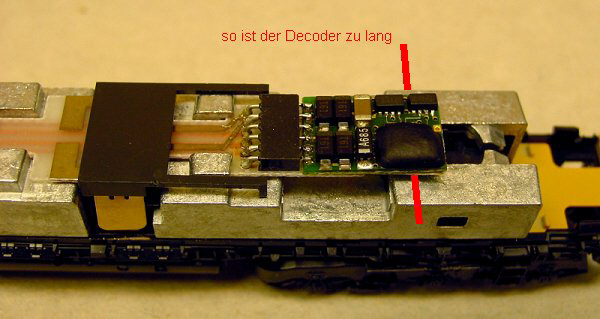 Der Decoder, hier ein DHL050 der völlig ausreicht, wird unter die Platine geklebt. Es passt auch ein Kühn N025 oder ein