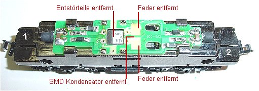Die Platine braucht nicht ausgebaut zu werden. Da die beiden Motorstromfedern sporadisch zu Kontaktschwierigkeiten neigen