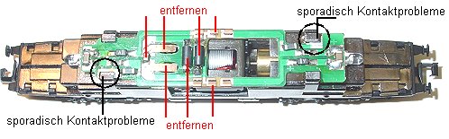 Die Platine braucht nicht ausgebaut zu werden. Da die beiden Motorstromfedern sporadisch zu Kontaktschwierigkeiten neigen