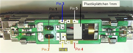 Decoder wird mit Doppelklebeband auf den rechten Fahrwerksteil und auf ein 1mm Plastikplättchen geklebt, Anschlösse zeigen zu