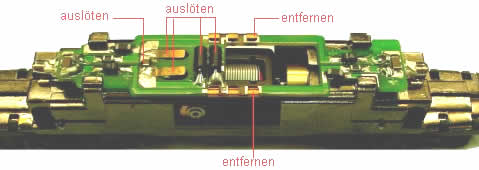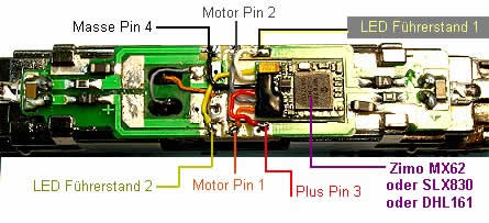 Umbauanleitung: Es wird ein DCC Decoder Zimo MX62 eingebaut. Da die Anschlösse gleich sind kann es auch ein SLX 830 oder DHL161 sein.