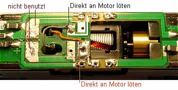 zum Motor herstellten, darum habe ich die Federn abgelötet und die Decoderlitzen direkt an die Motoranschlösse gelötet.