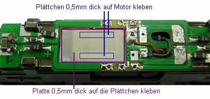 Auf den Motor werden ( m Bild oben und unten) zwei schmale Streifen Polystrol 0,5 mm dick, 2mm breit, 10 mm lang mit