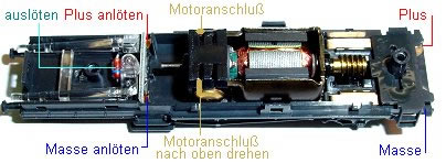 zu denken, das der Anschluss der Birne im Steuerwagen spiegelverkehrt ist. Die Motorfahnen werden nach oben gedreht