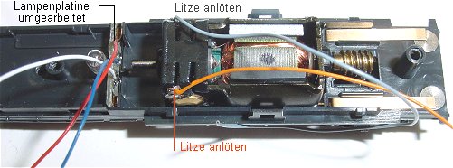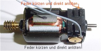 Motorfedern kürzen und je eine Litze orange und grau an den verbleibenden Federrest anlöten.