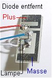 Diode entfernen. Die Lampe liegt an Masse und an der weißen Litze, keine Verbindung mit Plusseite.