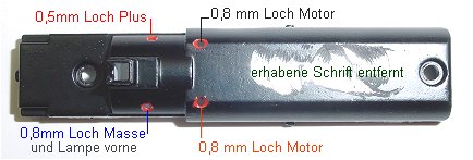 Draht an Masse und einer an die Litze gelötet wird. Plus darf keinen Kontakt zur Lampe haben. Die durchgefädelte Litze ist