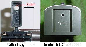 In beide Gehäuse wird je ein 1mm Loch gebohrt, höhe wie im Bild. In den Faltenbalg wird ein 2mm Loch gebohrt. (da sich beide