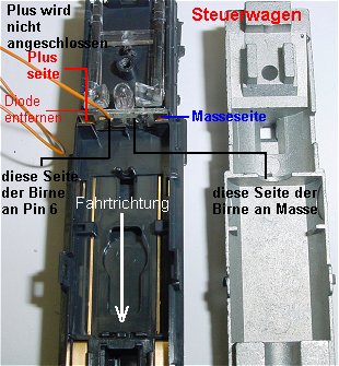 Die Steuerwagenplatine wurde bearbeitet. Wichtig ist ,nach entfernen der Diode die Lampenanschlösse so zu löten, das ein